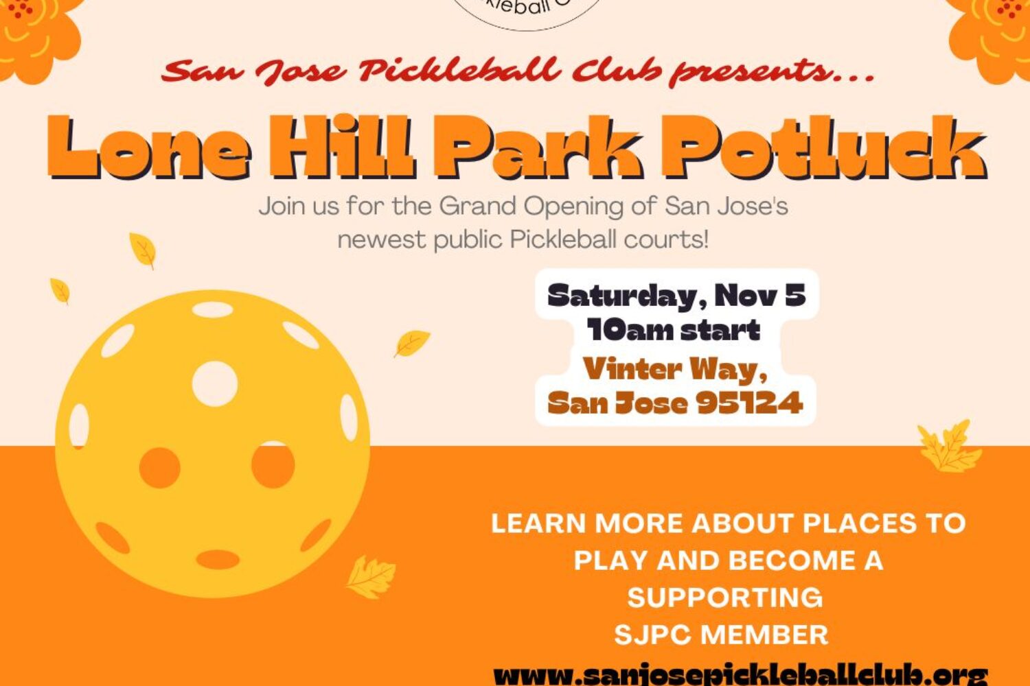 Please join us for the Grand Opening of Lone Hill Park – San Jose’s newest Pickleball courts. SJPC will host a potluck and pickleball drop-in. Please bring something to share -> this Saturday, Nov 5th at 10am – Vinter Way, San Jose.
