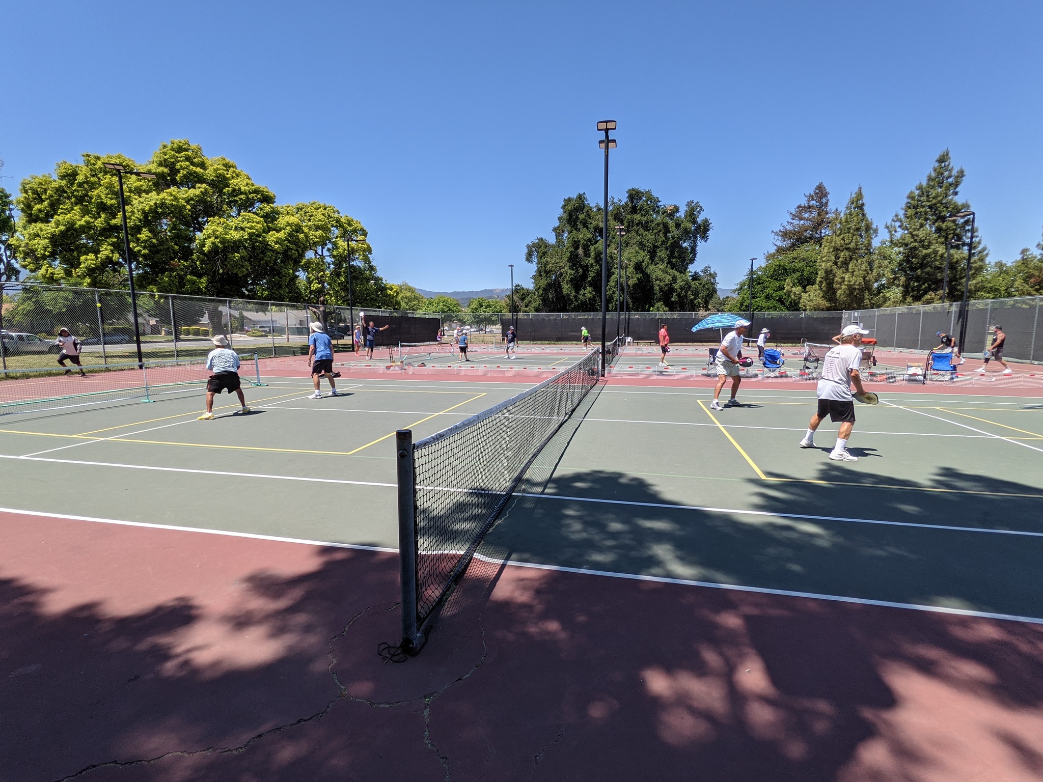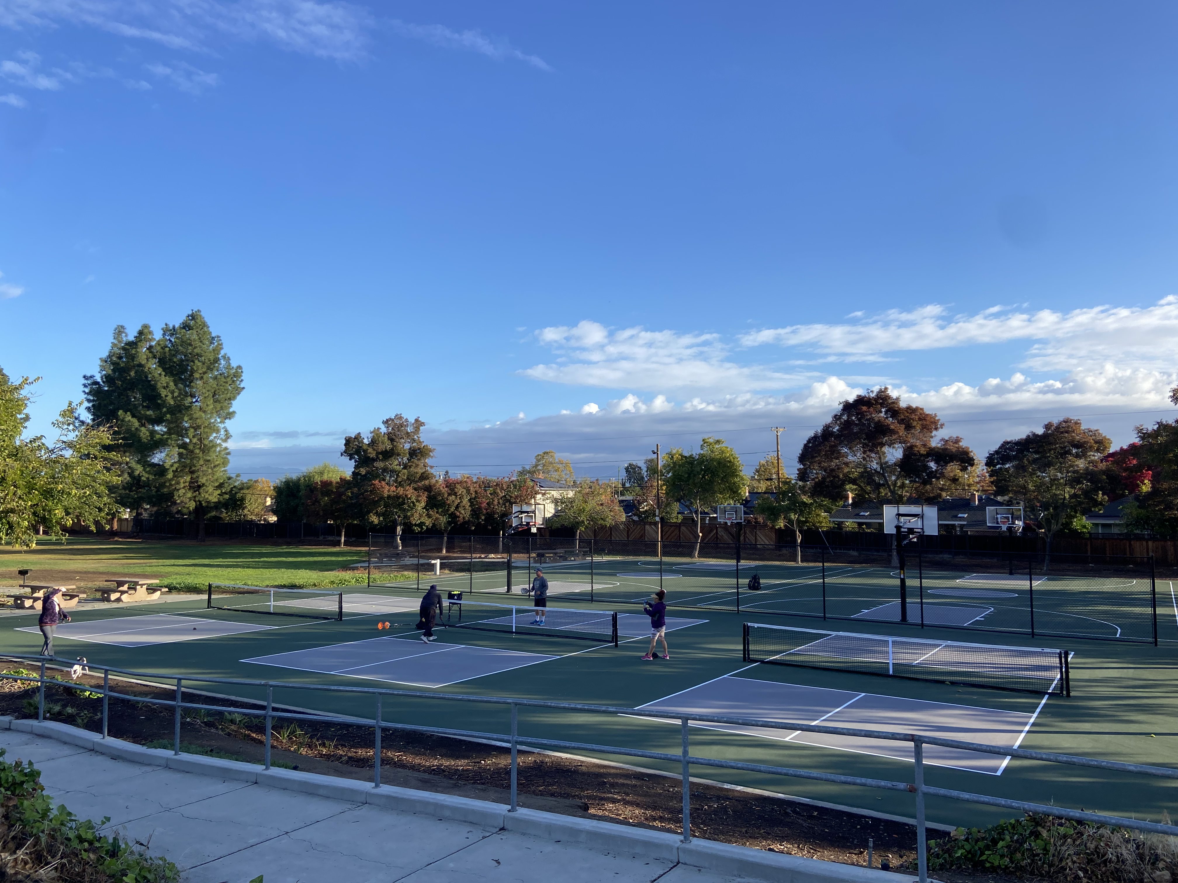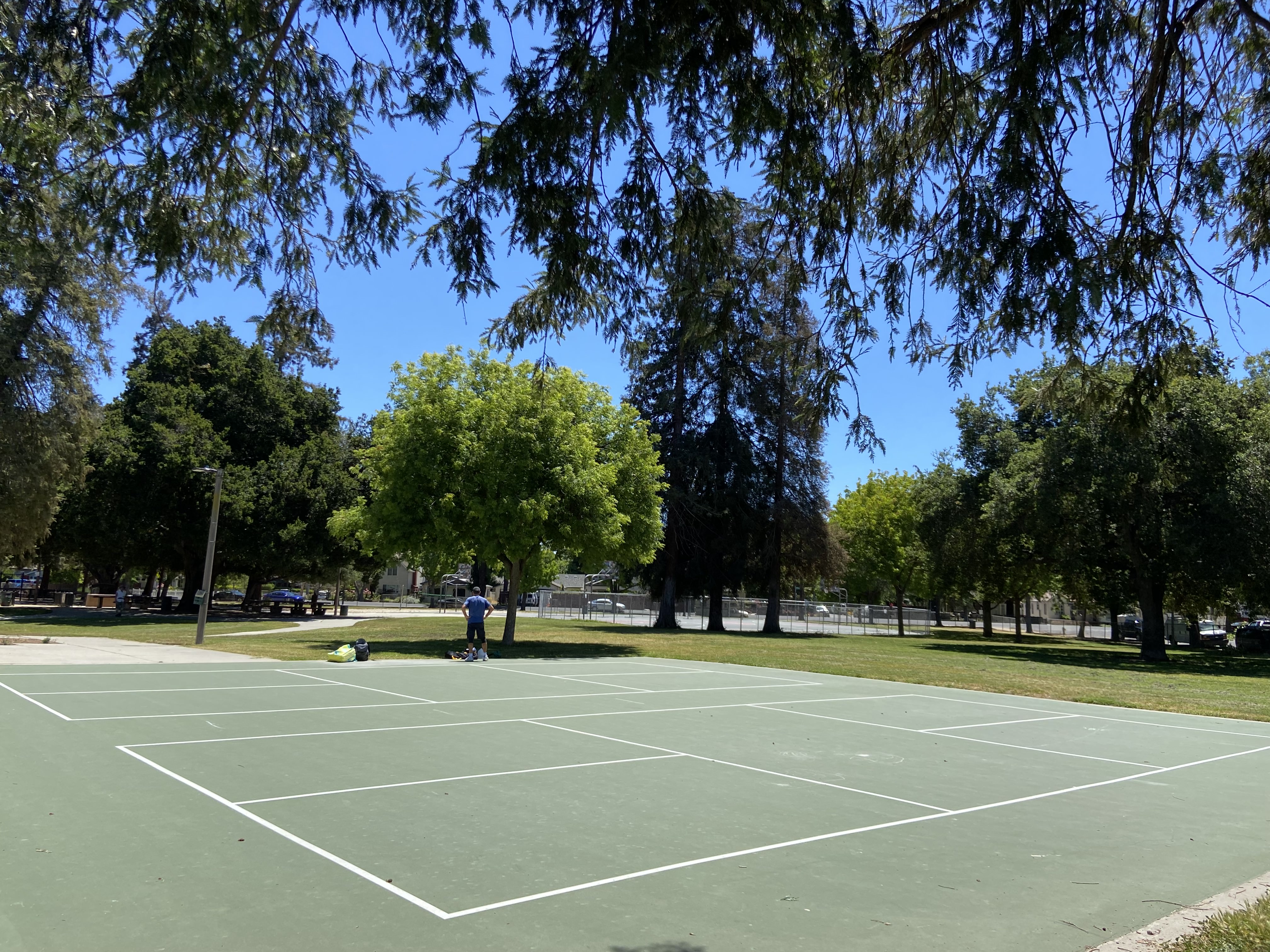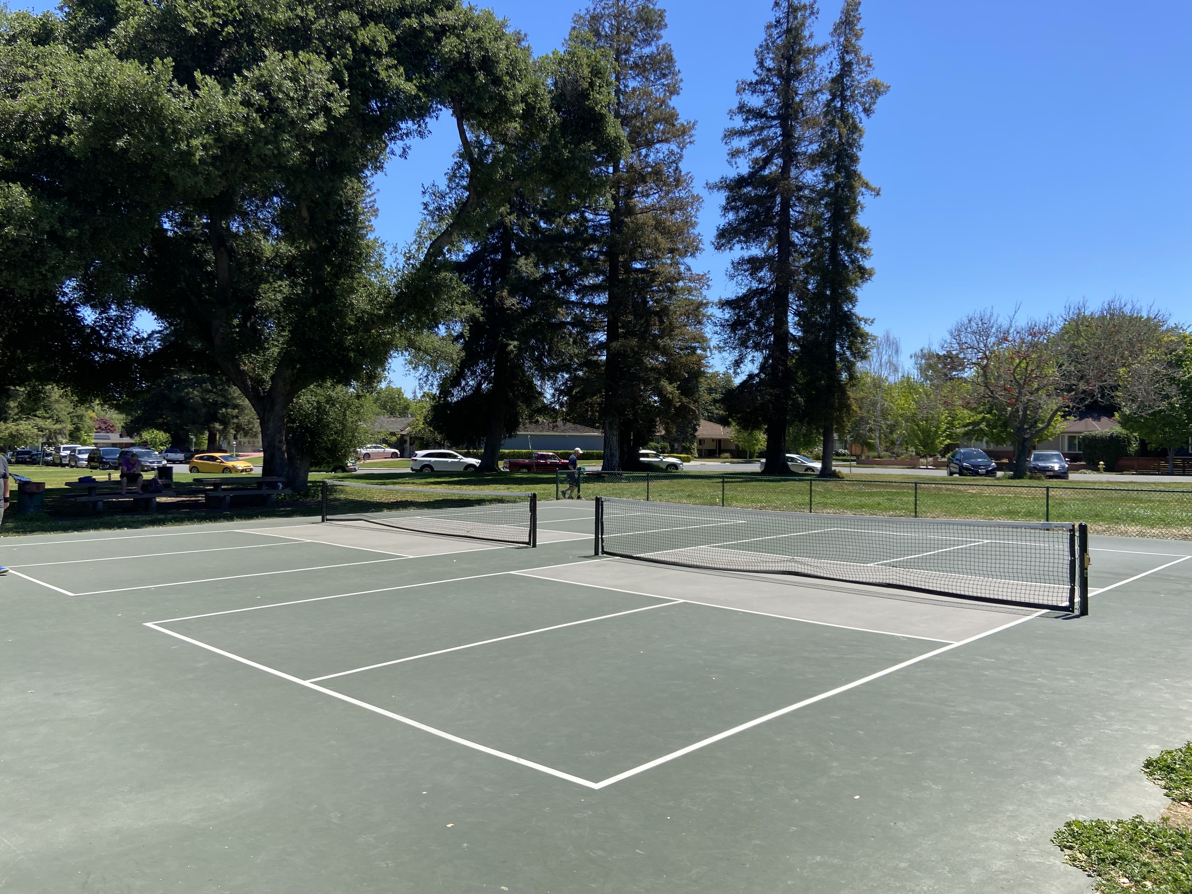 The first public pickleball courts in Blossom Valley. Beautiful nature walk, family and pet friendly location with ample parking. Four overlays on one fenced in tennis court. Four SJPC nets permanently on-site, please move off to the side when you’re done. Does not have established drop-in play schedule yet.